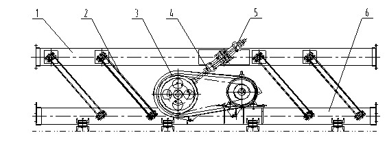 FZS型單質體連桿振動輸送機的結構由1輸送槽、2主振板彈簧、3驅動機構、4連桿、5連桿螺旋彈簧、6底架等組成。驅動機構由電動機,皮帶輪、傳動軸、偏心裝置組成,輸送槽與底架之間用板彈簧聯接,該板彈簧既是主振彈簧,又起輸送槽振動導向作用,輸送機運行中驅動機構使連桿端部作往復運動,而連桿通過其端部的螺旋彈簧帶動輸送槽作往復運動,使物料沿振動方向被連續拋起向前跳躍,達到輸送物料的目的。